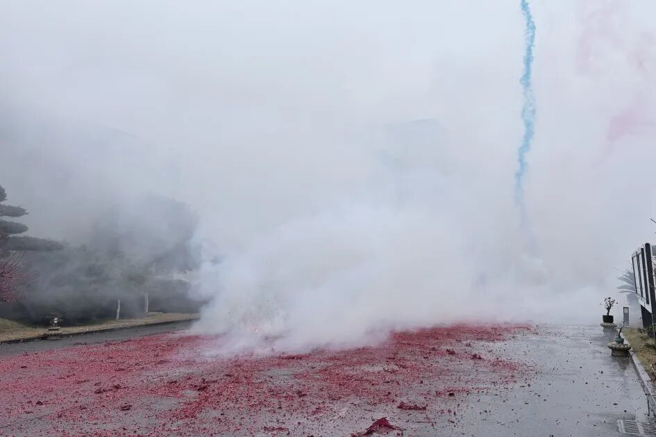 鞭炮齊鳴,紅綢鋪地